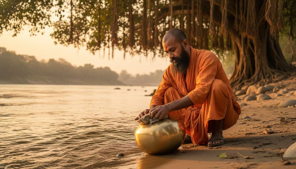 A traditional Indian wandering monk in simple cloth scrubs a shining brass pot on the Ganga river bank